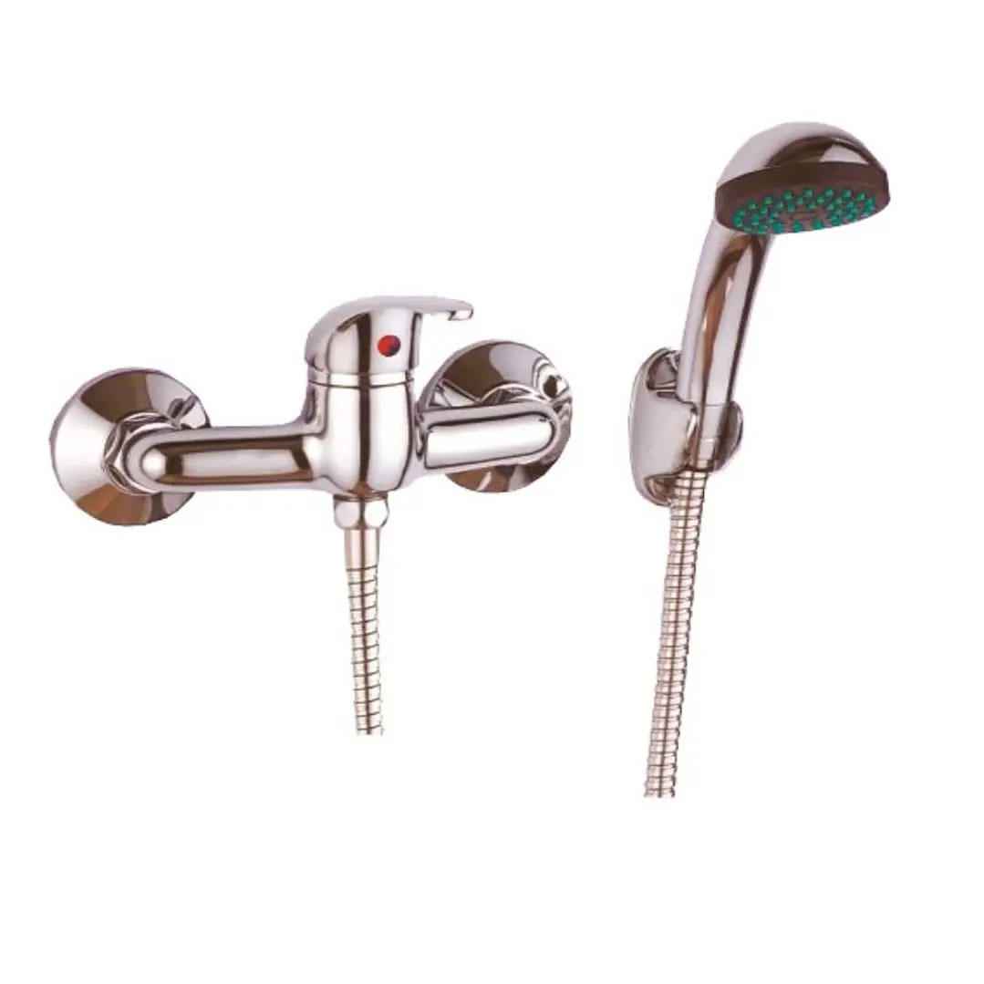 Con juego de ducha: mango (1 función), soporte (plástico cromado) y flexible (doble grapeado, tuercas de latón).